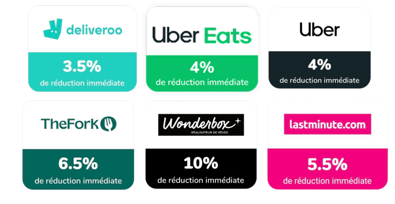 Profitez de moments gourmands et d’expériences uniques grâce à nos Bons d’achat pour la restauration, les loisirs et les sorties. Commandez vos repas avec Uber Eats ou Deliveroo, réservez un restaurant avec The Fork, ou organisez un séjour avec Lastminute.com et Wonderbox. Des plans astucieux pour profiter de sorties et expériences à prix réduit.